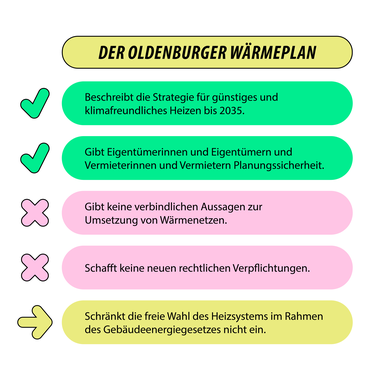 Für die Umstellung auf günstiges klimafreundliches Heizen bis 2035 bündelt Oldenburg alle Kräfte. Wirksame Maßnahmen der Stadtverwaltung helfen dabei, die Wärmewende erfolgreich zu meistern. Beispielweise unterstützt ein breites Informationsangebot Bürgerinnen und Bürger beim Heizungstausch. Organisatorische und technische Maßnahmen beschleunigen beispielsweise die Planung und Umsetzung von Wärmenetzen besonders in den Gebieten Alte Fleiwa, Stadtkern und Kreyenbrück, rund um das Klinikum.